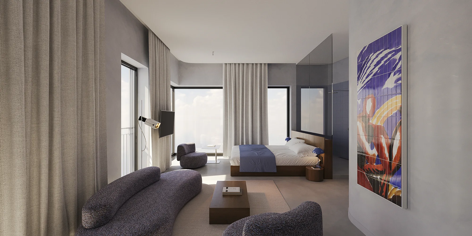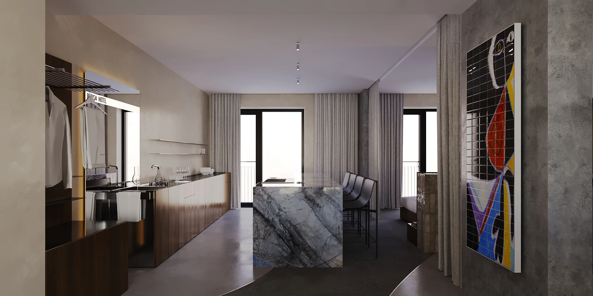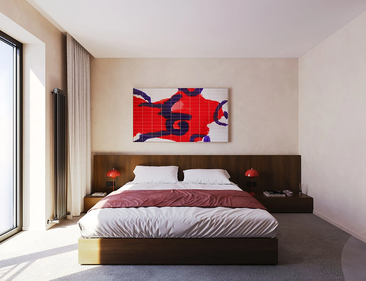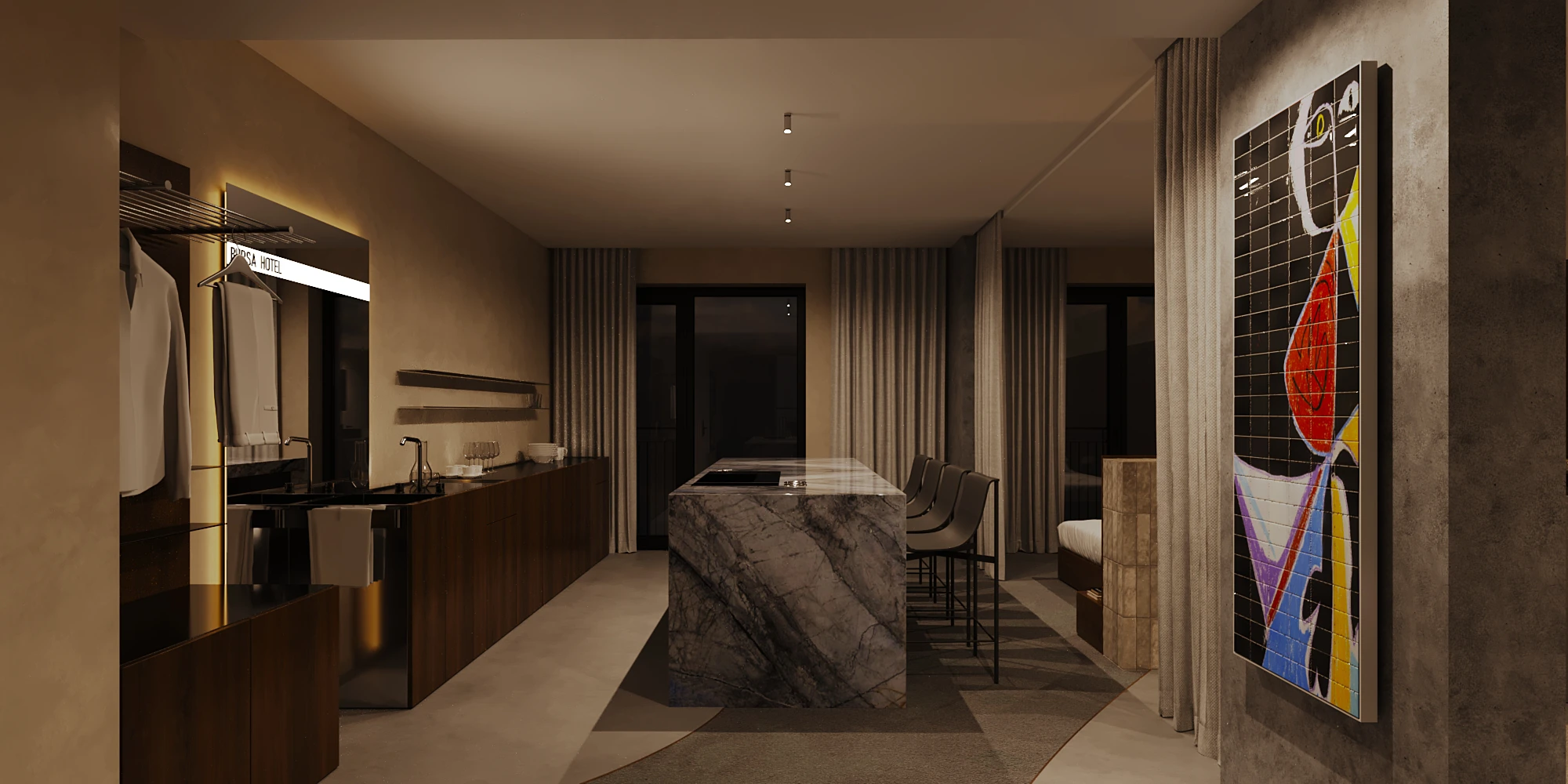 The light design, meticulously crafted by EXPOLIGHT, adds an air of elegance, ensuring a harmonious blend of comfort and aesthetics in every corner. Adding to this refined atmosphere, every room features exclusive artworks by celebrated Ukrainian artists, turning each space into a private gallery that salutes local talent and creativity.